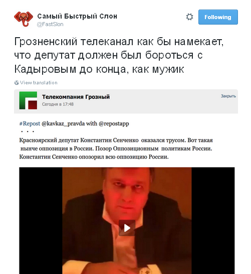 «Грозненский телеканал как бы намекает, что депутат должен был бороться с Кадыровым до конца, как мужик», — комментируют в Twitter «Самый Быстрый Слон».