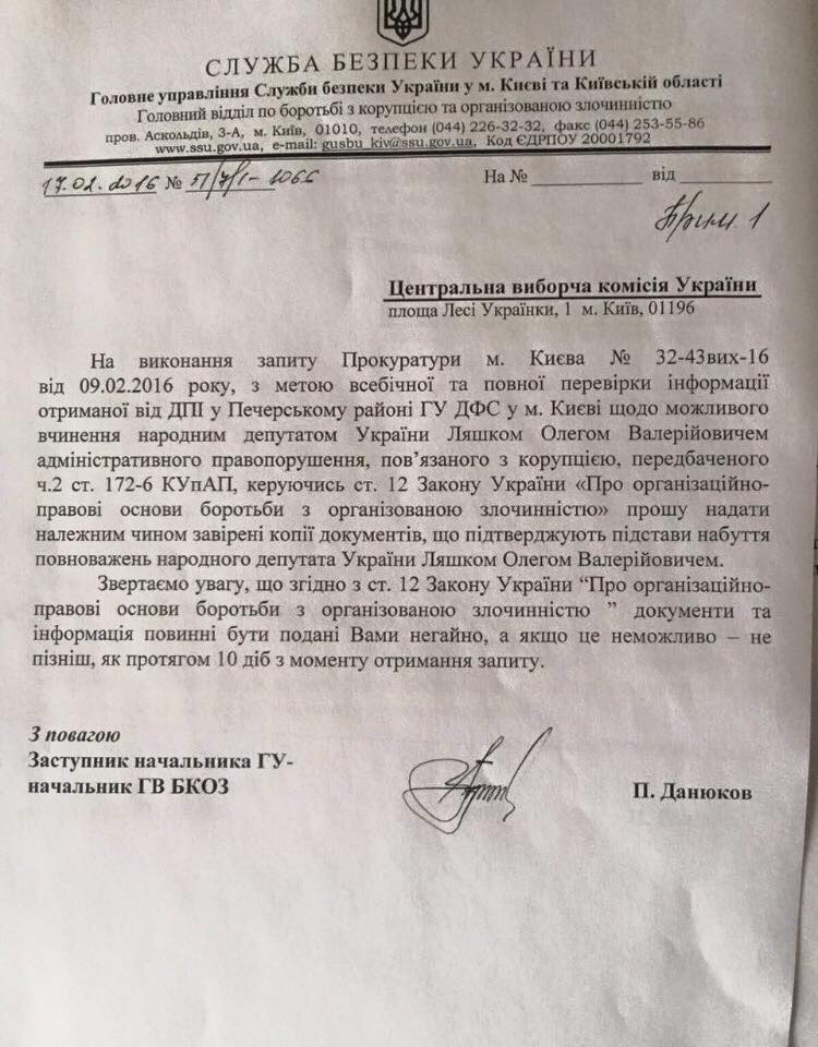 В тексте документа отмечается, что проверка проводится во исполнение запроса прокуратуры города Киева от 9 февраля 2016 года, с целью всесторонней и полной проверки информации, полученной от ГНИ в Печерском районе ГУ ГФС в г. Киеве о возможном совершении народным депутатом Украины Ляшко Олегом Валерьевичем административного правонарушения, связанного с коррупцией.