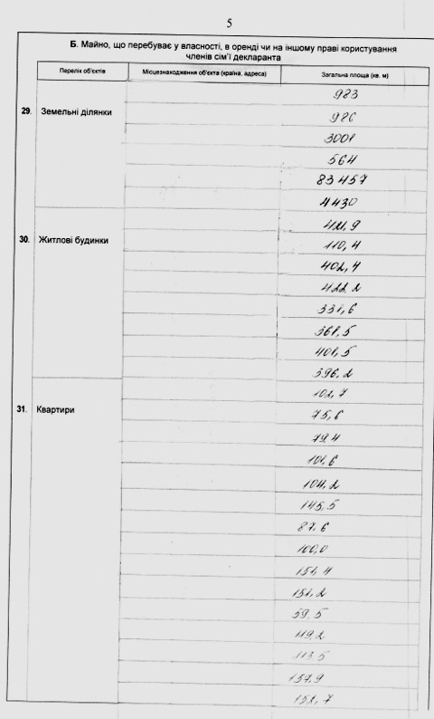 В собственности Сагайдака 1/4 квартиры площадью 70,5 кв. м (17,6 кв. м). В собственности его семьи – 6 земельных участков (площадью 983, 986, 3001, 564, 83457 и 4430 кв.м), 8 жилых домов (от 110 до 420 кв.м), 29 квартир (от 58 до 844 кв.м), 15 гаражей (каждый по 13,8 кв.м) и 8 объектами недвижимого имущества.