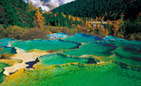 Окруженная красными скалами, местность усеяна небольшими каскадными водоемами с голубой водой, на дне которых поблескивают на солнце россыпи желтых кальцинизированных отложений, благодаря которым озера и получили свое название – Озера Желтого дракона