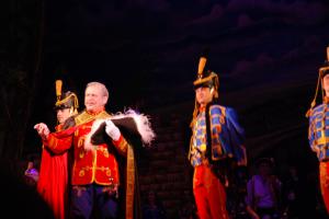 Действительно, выход графа Омоная совершенно триумфальный: почти все артисты, занятые в спектакле выстраиваются на сцене (среди них я вижу волнующуюся Ирину Лапину, она блестяще играет Мирабеллу), звучит барабанная дробь в исполнении нескольких прекрасных девушек, и вот перед нами – граф Омонай, стройный, подтянутый, обаятельный, с горящим взглядом и сильным голосом.