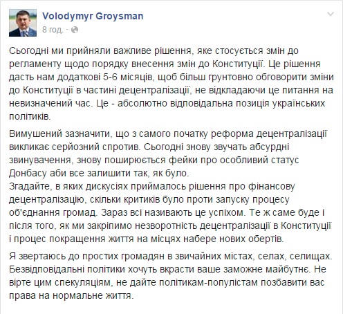 Голосование в парламенте по изменениям положений регламента и даже внесение новых положений в регламент, которые касаются конституционной процедуры, говорят о том, что 300 голосов нет. Парламент вносит новые положения, которые фактически говорят о том, что «следующая очередная сессия» – это через сессию, тем самым продолжая возможность рассматривать закон о внесении изменений в Конституцию в части децентрализации власти в четвертой сессии.