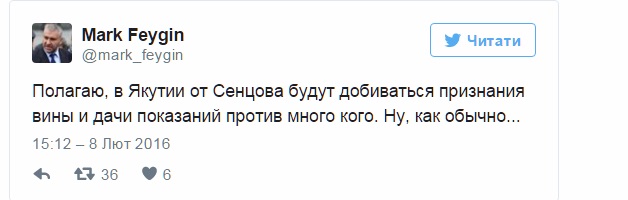 Продолжая цитату Фейгина: «Полагаю, в Якутии от Сенцова будут добиваться признания вины и дачи показаний против много кого. Ну, как обычно». Будут добиваться – это значит «будут пытать»?