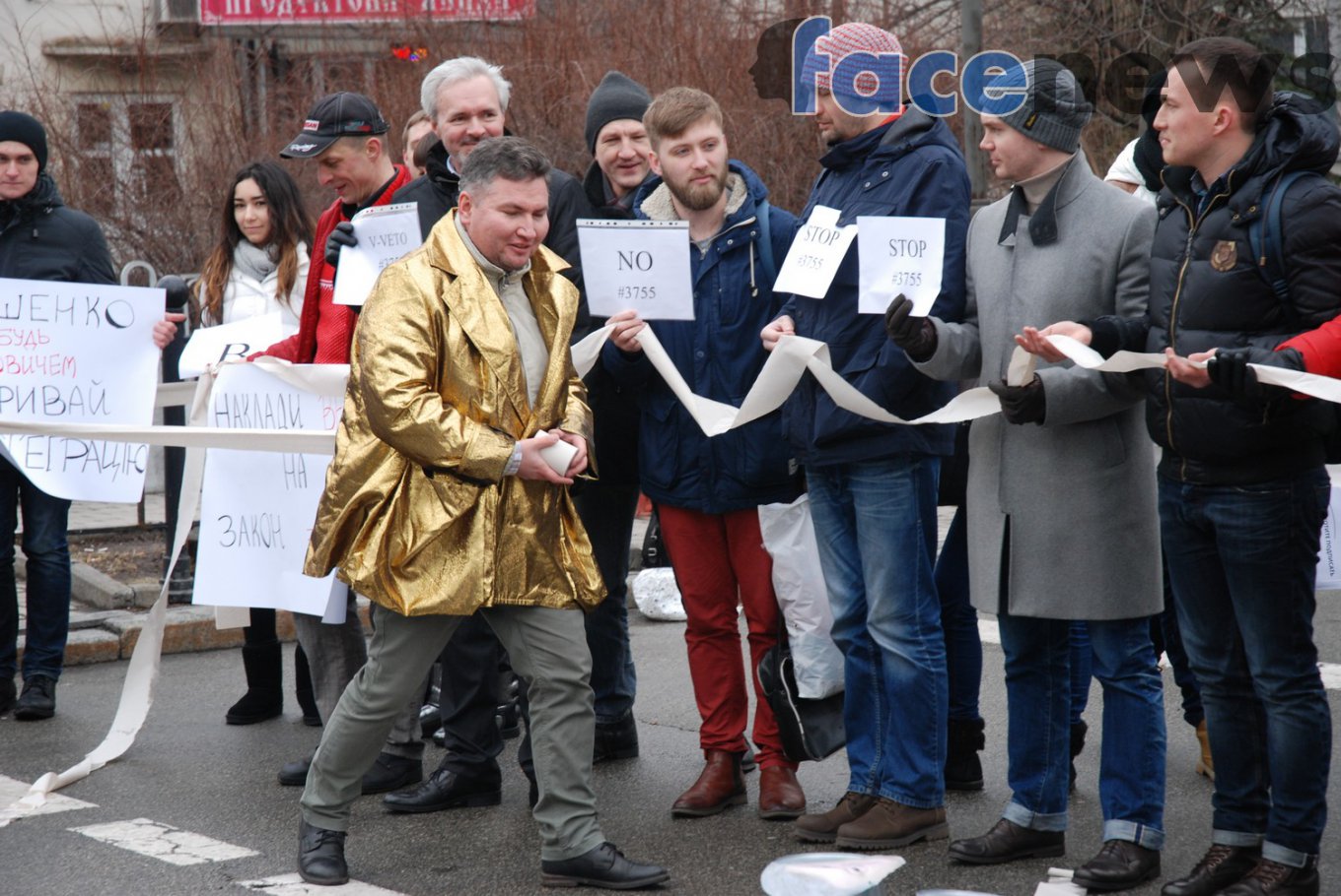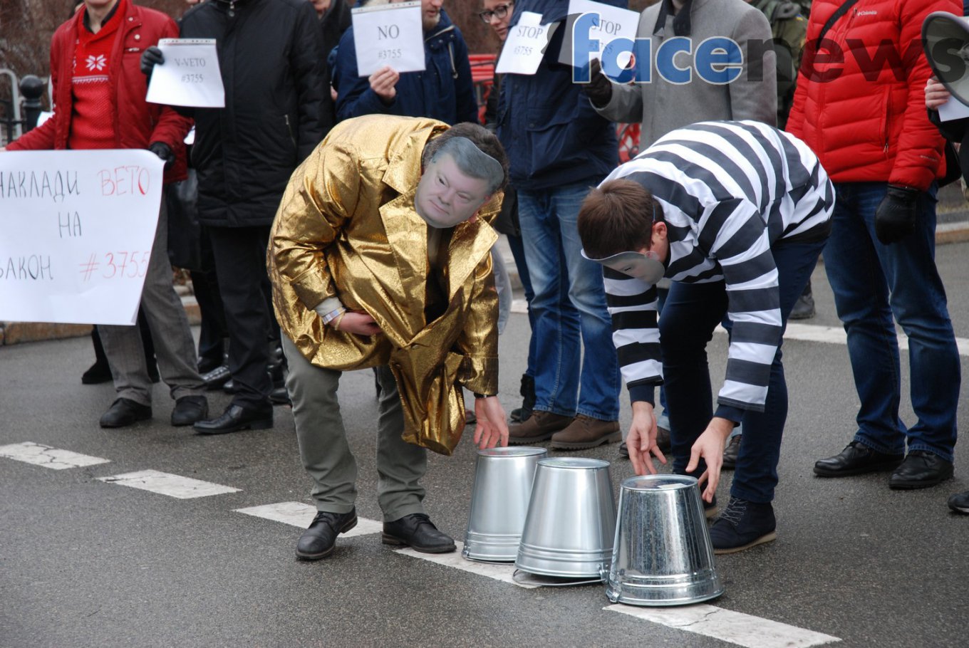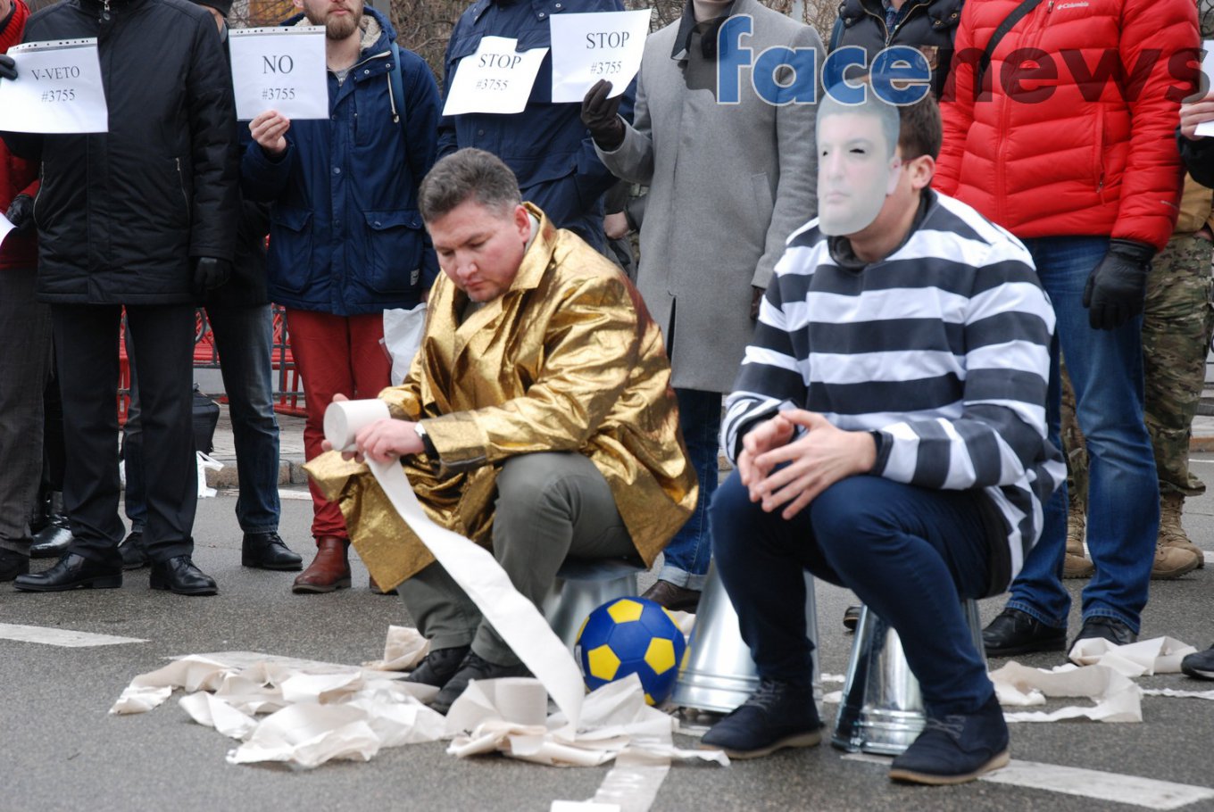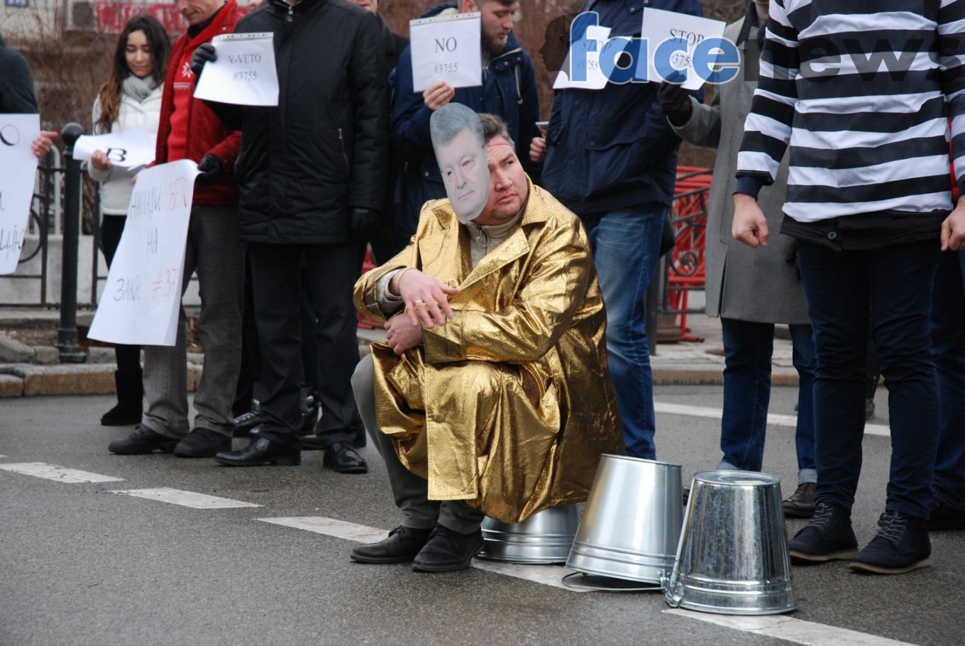 Общественность негодует: «Порошенко, не будь Януковичем, не срывай евроинтеграцию!». Сегодня активисты пришли под Администрацию президента с требованием наложить вето на закон №3755 об электронном декларировании. Там же они разыграли тематический перформанс.