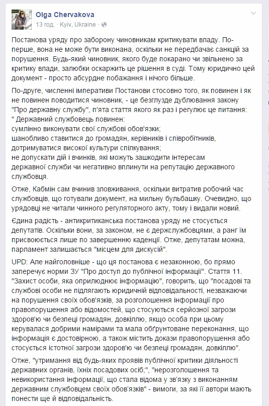 Народный депутат от Блока Петра Порошенко Ольга Червакова назвала постановление незаконным.