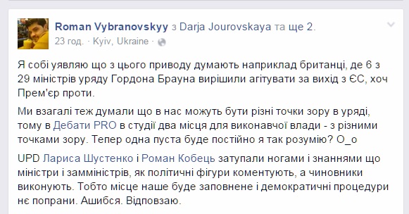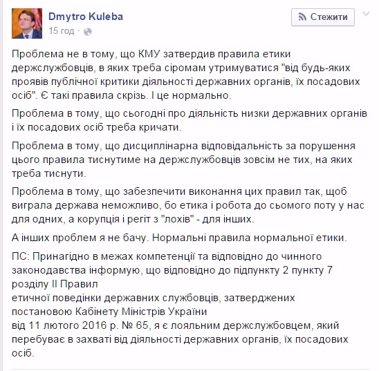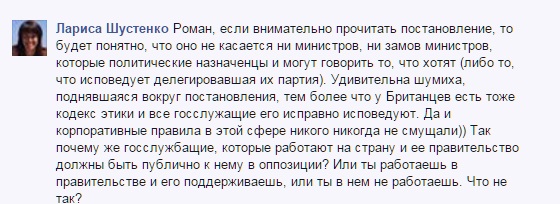 Вообще-то такие вещи (этическое поведение – Ред.) должны поддерживаться общественным мнением, а никак не принятием каких-то новых кодексов или постановлений Кабмина, которые запрещают критиковать чиновников. Конечно, есть определенные морально-этические нормы. Если ты работаешь в команде, то, пожалуйста, или говори прямо в глаза, с чем не согласен, или уходи из команды. Но не выноси на публику, что тебе что-то не нравится. Это нормальное поведение человека, который работает в команде, кстати.