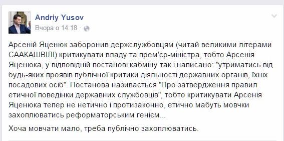 Блогер Андрей Юсов связал введенный Кабинетом министров запрет на критику власти с конфликтом, существующим между Арсением Яценюком и Михеилом Саакашвили.