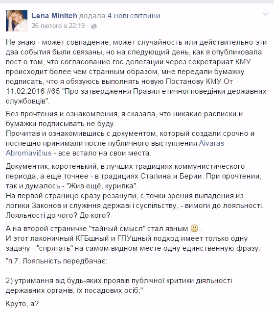 На днях директор Департамента цифровой экономики Минэкономразвития Елена Минич писала, что такие правила создали после публичного выступления Абромавичуса