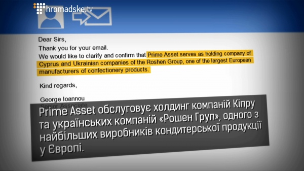 «Prime Asset обслуговує холдинг компаній Кіпру та українських компаній «Рошен Груп», одного з найбільших виробників кондитерської продукції у Європі».