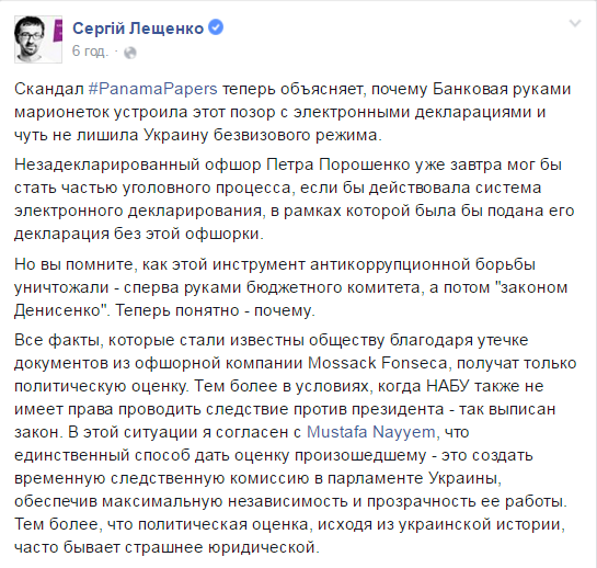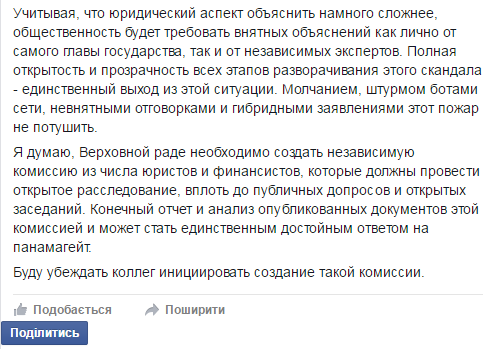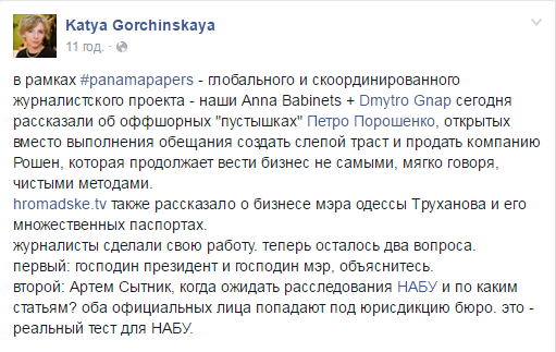 Вечером 3 апреля международные журналисты-расследователи опубликовали материалы об оффшорных компаниях влиятельных людей. «Панамские документы» сразу же стали резонансными. Среди 12 фигурантов скандала оказался и президент Украины Петр Порошенко, о расследовании в отношении которого идет речь в материале «Подвійне життя президента».