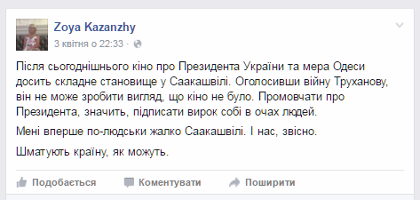 Экс-заместитель губернатора Одесской области Зоя Казанжи на своей странице в Facebook подчеркнула особую необходимость для Саакашвили прокомментировать оффшорный скандал: «Промолчать о президенте, значит, подписать приговор себе в глазах людей. Мне впервые по-человечески жалко Саакашвили», – написала она. Насколько все-таки «Движению за очищение» целесообразно сейчас молчать?