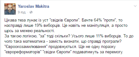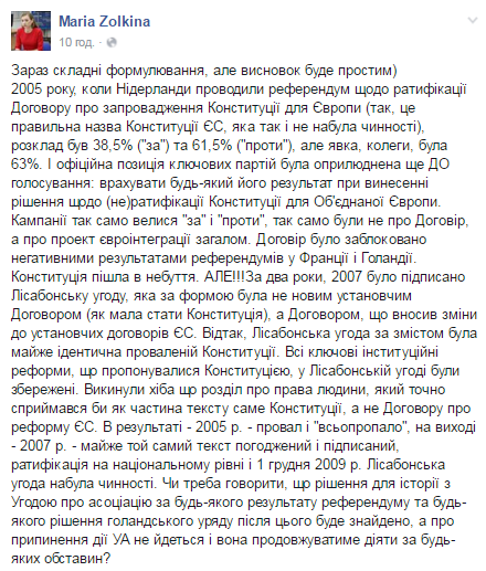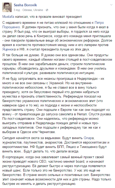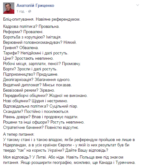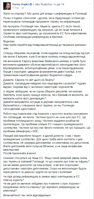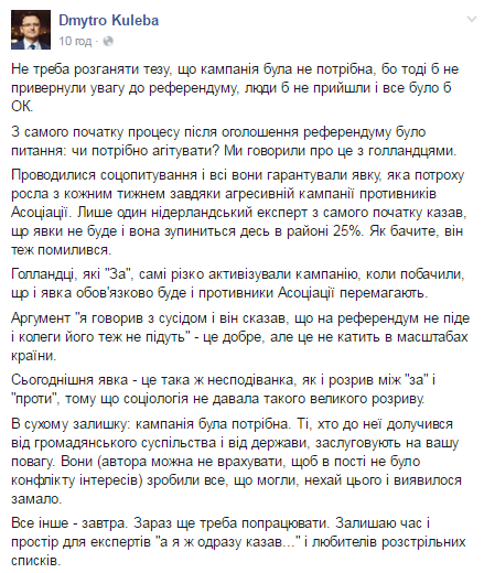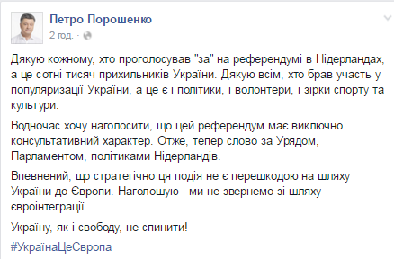 «Хотел бы всем напомнить, что истинная цель организаторов референдума – это не Соглашение об ассоциации между Украиной и Европейским Союзом. Это атака на единство Европы, атака на распространение европейских ценностей. Об этом также свидетельствует и дискуссия, которая была развернута в преддверии референдума», – уверен президент Украины.