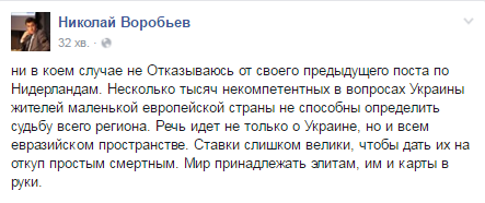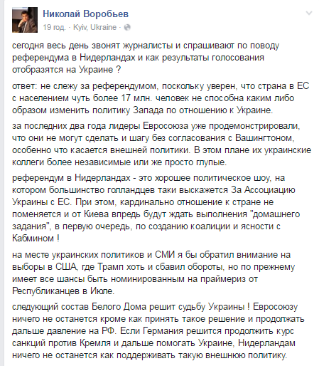 Николай Воробьев: Референдум в Нидерландах – это хорошее политическое шоу