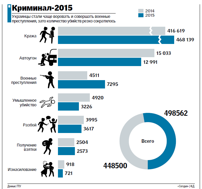 «Согласно статистике, гораздо чаще украинцы обращались к правоохранителям из-за краж – почти на 50 тысяч случаев больше, чем в предыдущем году. Правда, из 468 139 краж в 2015 году на учет поставили только половину – 226 833 (остальные отсеялись из-за отсутствия состава преступления)», – пишут журналисты.