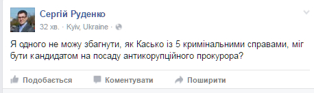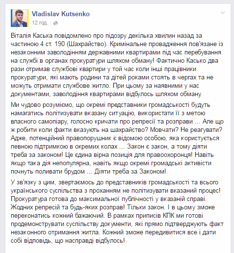 Поздно вечером 10 мая сотрудники прокуратуры сообщили о подозрении в совершении преступления бывшему заместителю генерального прокурора Виталию Касько. Об этом на своей странице в Facebook сообщил прокурор ГПУ Владислав Куценко.