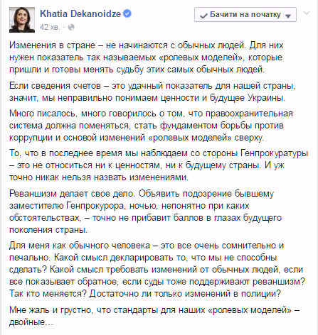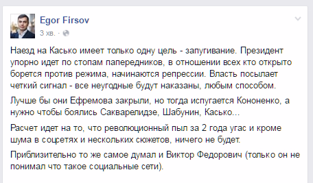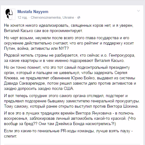 «При своем увольнении 15 февраля я сообщил, почему увольняюсь, и что буду делать после этого. С 16 февраля я восстановил право на адвокатскую деятельность и являюсь адвокатом, о чем прекрасно было известно ГПУ и следователям ГПУ. Но, судя по вчерашним событиям, за мной была организована слежка, при том что ни одного статуса в уголовном производстве не было. Это грубое нарушение конституционных прав гражданина и адвоката», – объясняет он.