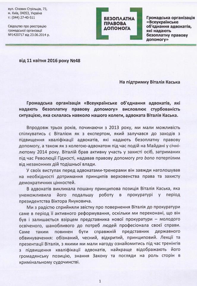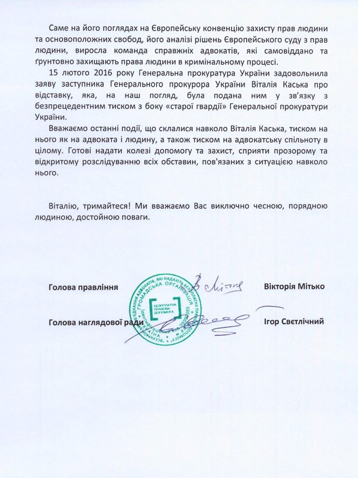 Также в поддержку Касько высказались во Всеукраинском объединении «Совет адвокатов Украины».