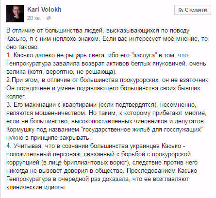 «Когда я увольнялся, то высказал свою мысль в отношении того, кто сейчас руководит в ГПУ. По моему мнению, эти люди – яркие последователи прокурора Пшонки, на которых опирался еще недавно Шокин. Боятся они одного – изменений в прокуратуре, в которых им не будет места. Почему я опасен для них? Потому что я всегда высказываю свои взгляды вслух и не боюсь. Меня словили поздно вечером, при том что никаких вызовов от ГПУ на адрес своего постоянного проживания я не получал», – говорит Касько.