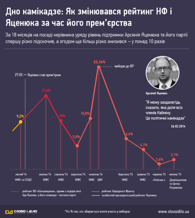 Так, согласно данным Киевского международного института социологии, если бы выборы в парламент происходили в средине марта, то «Народный фронт» Арсения Яценюка получил бы 1,9% голосов.