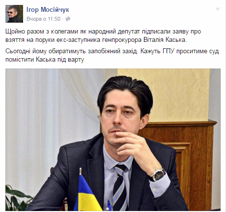 Сегодня Киевский Печерский суд рассматривал ходатайство Генеральной прокуратуры Украины об избрании экс-заместителю генпрокурора Виталию Касько меры пресечения в виде содержания под стражей или залога в размере 1,8 миллиона гривень. Вместо требований стороны обвинения, суд применил к Касько меру «личное обязательство». Эта мера предусматривает следующее: по первому требованию следователя являться на допрос и не покидать населенный пункт до 10 июня 2016 года.