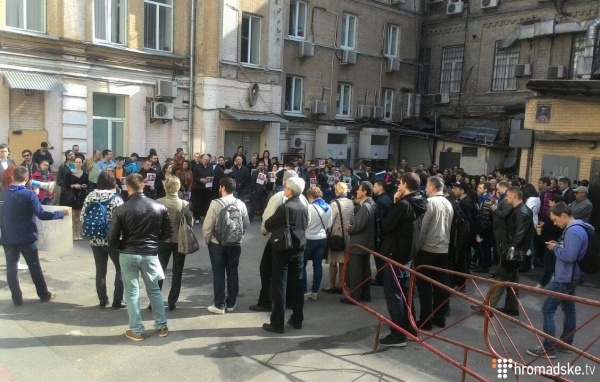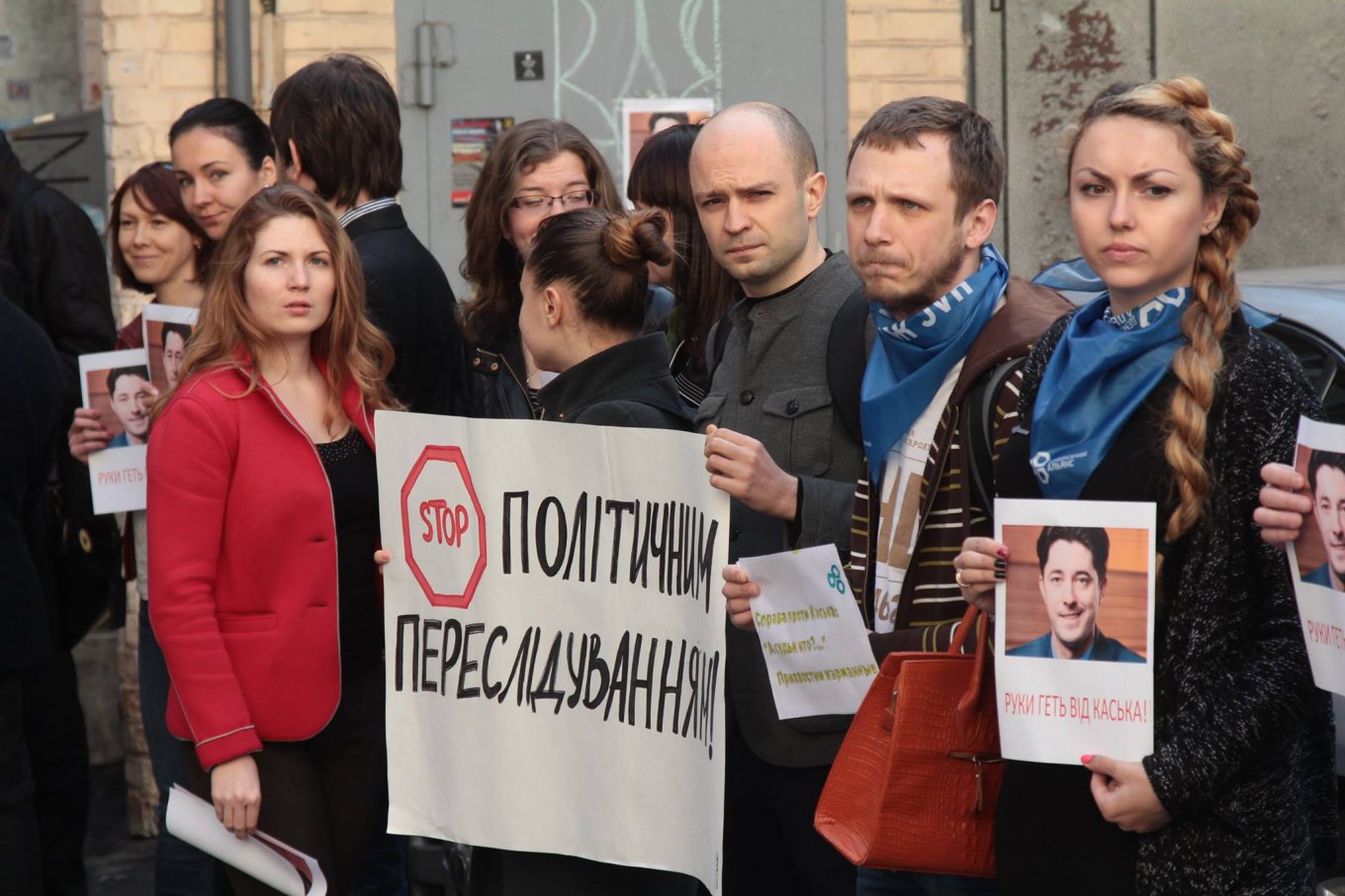 Перед началом судебного заседания перед зданием собралась группа пикетчиков в поддержку Виталия Касько. Они держали фотографии Касько и плакаты с надписями – «Процесс над Касько – это расправа».