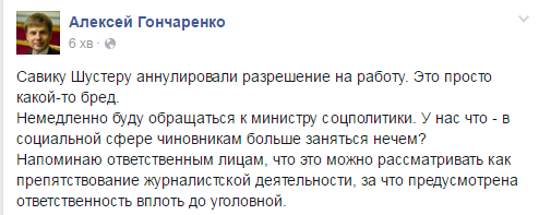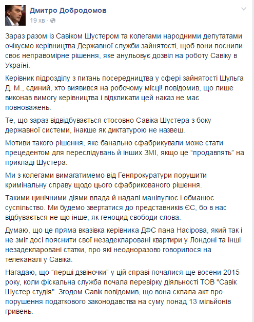 «Две недели назад мы получили продление разрешения на работу для Савика. Вчера появилось много информации о том, что это разрешение было аннулировано. Мы считали, что это «утка». Однако во вторник утром наши юристы связались с центром занятости, и те устно подтвердили эту информацию», – отмечает партнер Савика Шустера по каналу Павел Елизаров.