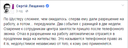 «22.04.2016 в Государственную службу занятости пришло письмо от Государственной фискальной службы Украины о том, что в отношении гражданина Канады Шустера осуществляется уголовное производство. Таким образом, на момент принятия Киевским городским центром занятости решения о продлении разрешения на применение работодателем труда Шустера не учтен факт совершения в отношении указанного иностранца уголовного производства», – объясняют в Государственной службе занятости.