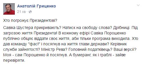 Анатолий Гриценко: Кто дал команду «фас» и посягнул на жизнь головы государства?