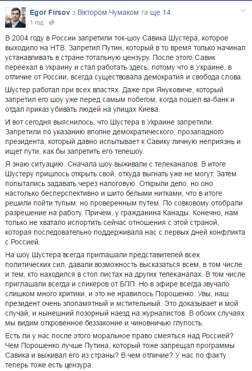 Егор Фирсов: Чем Порошенко лучше Путина, который тоже запрещал программы Савика и выживал его из страны?
