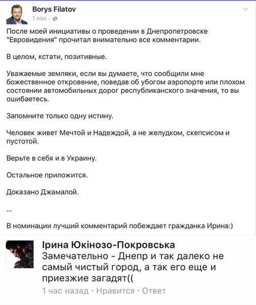 «Русскоязычный город, остановивший «русский мир». «Южная столица» Российской империи, заколотившая в гроб «Новороссию». Сердце казацкого края. Город с еврейской душой. Новый дом для 76 тысяч переселенцев с украинского Донбасса. Родина добровольческого движения. Единая команда местного, областного советов и облгосадминистрации. Сильнейшие и крупнейшие национальные общины. Развитая инфраструктура. Это лишь несколько причин провести Евровидение в Днепропетровске. На завтра (на понедельник 16 мая, – FaceNews) готовлю обращение к премьер-министру», – отмечает Борис Филатов в своем Facebook.