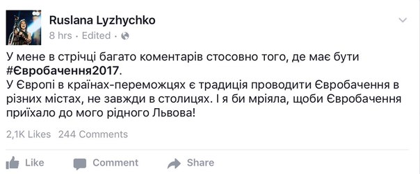 «У меня в ленте много комментариев относительно того, где должно быть Евровидение-2017. В Европе в странах-победителях есть традиция проводить Евровидение в разных городах, не всегда в столицах. И я бы мечтала, чтобы Евровидение приехало в мой родной Львов», – подчеркивает Руслана.