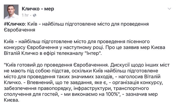 «Киев готов к проведению Евровидения. Дискуссии относительно других городов не имеют под собой оснований, поскольку Киев – наиболее подготовленный город для проведения таких значимых мероприятий. Уверен, что задание, которое есть, – организация конкурса, обеспечение правопорядка, инфраструктуры, транспортного сообщения для гостей, – мы выполним на 100%», – отмечает мэр Киева.