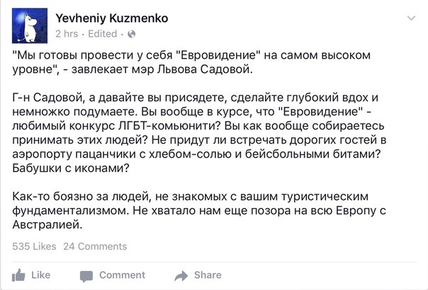 «Г-н Садовой, а давайте вы присядете, сделайте глубокий вдох и немножко подумаете. Вы вообще в курсе, что Евровидение – любимый конкурс ЛГБТ-комьюнити? Вы как вообще собираетесь принимать этих людей? Не придут ли встречать дорогих гостей в аэропорту пацанчики с хлебом-солью и бейсбольными битами? Бабушки с иконами? Как-то боязно за людей, не знакомых с вашим туристическим фундаментализмом. Не хватало нам еще позора на всю Европу с Австралией», – отмечает в своем Facebook журналист Евгений Кузьменко.