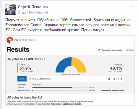 Великобритания выходит из ЕС. По результатам подсчета 100% голосов, на референдуме 51,9% британцев проголосовали за выход страны из ЕС и 48% - за сохранение участия в объединении.