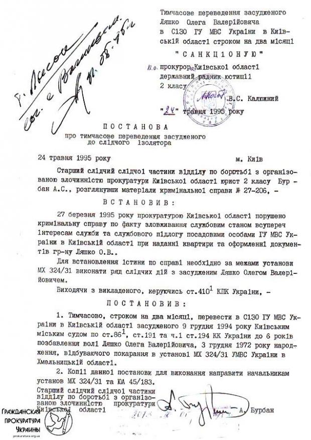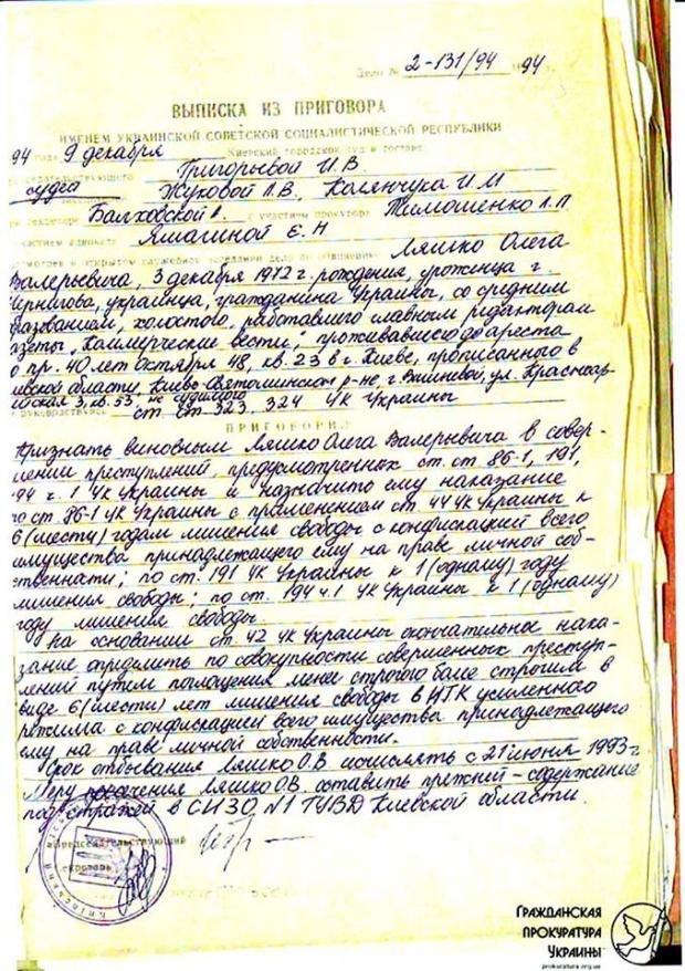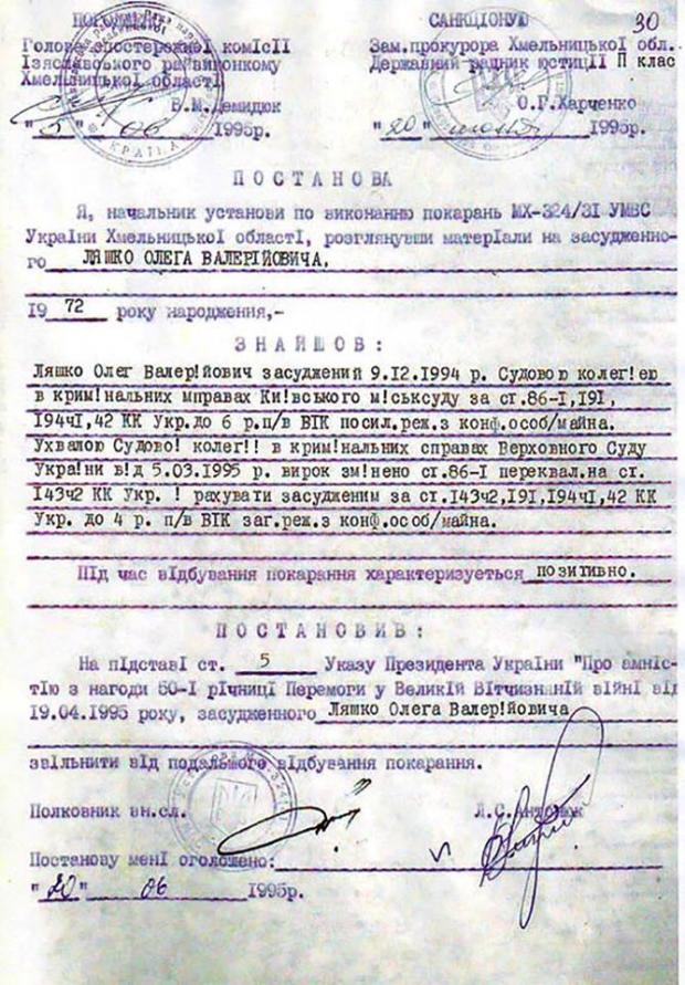 «9 декабря 1994 суд признал Ляшко виновным в хищении государственного имущества, присвоении власти, подделке документов. Ему светило 10 лет, но получил только шесть. Позже суд смягчил статью на мошенничество. По амнистии Олег Валерьевич вышел из Изяславской колонии и занялся политикой. Стал писать оппозиционные статьи, работать в «Батькивщине».
