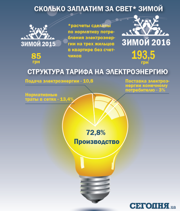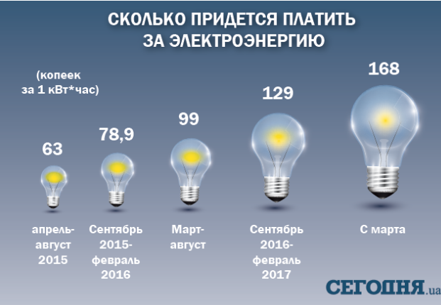 В марте 2015-го Национальная комиссия, осуществляющая регулирование в сфере энергетики и коммунальных услуг (НКРЭКУ), приняла решение повысить тариф на электроэнергию в пять этапов (постановление №220). До марта прошлого года семья, которая потребляет от 100 до 600 кВт*час электроэнергии в месяц, платила за каждый киловатт 36,6 копеек. В сентябре прошлого года тариф подняли до 78,9, в марте этого года – до 99 копеек, а сегодня – до 129 копеек.