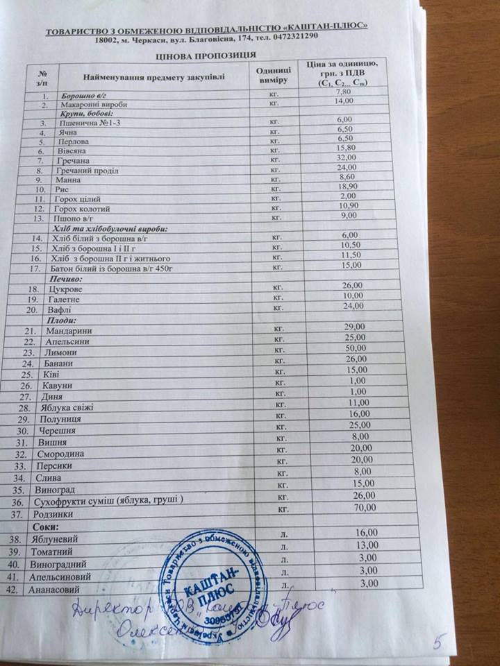 На тендер отозвались аж 11 поставщиков, пятерых зарезали сразу - из-за претензий к предложениям, но никто официально не жаловался. Из оставшихся выбирали одного исполнителя и 21 сентября утвердили ООО «Каштан-плюс». Это известный в городе поставщик пищи, прежде всего тем, что ранее был монополистом по питанию в больницах Черкассах (104 млн грн. на два года).