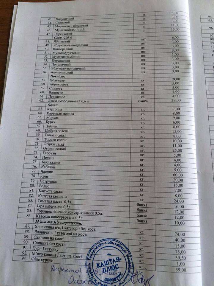 «Каштан-плюс» смешал в своем предложении нормальные, коррупционные и нереальные цены. Вот фотокопия, обнародованная коллегами из «Крапивы». Любой, кто сам покупает продукты в магазинах и рынках, сразу легко поймет всю глубину глубин: