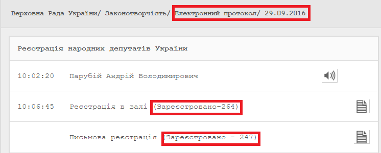 Действительно согласно данным регистрации, опубликованным на сайте Верховной Рады, в начале заседания в зале зарегистрировались 264 парламентария, а письменную регистрацию прошли всего 247 человек.
