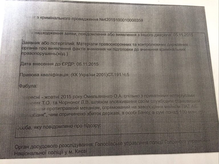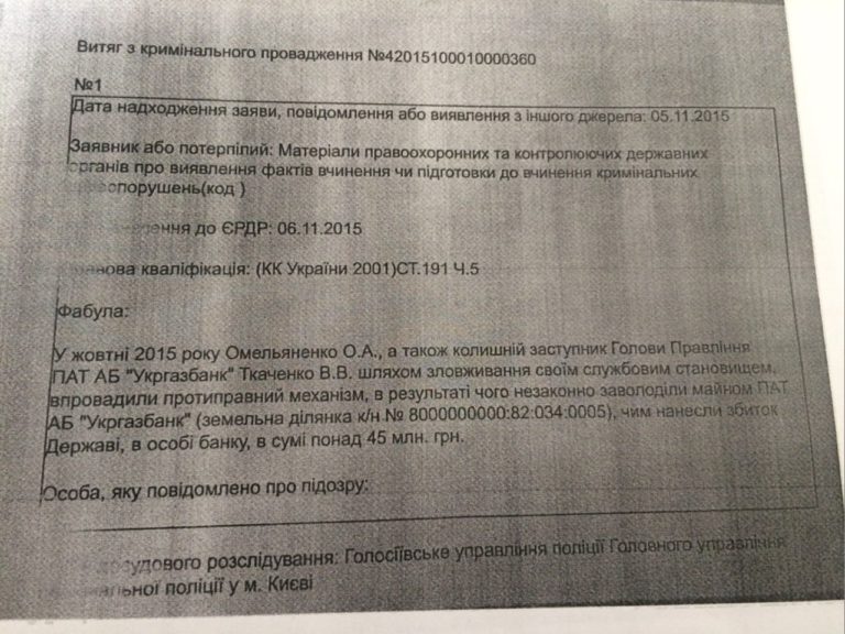 Есть, конечно, надежда, что новый министр финансов все же заинтересуется откровенно криминально-коррупционной ситуацией вокруг компании, в зоне ответственности которой все еще находится обеспечение своевременного начисления налогов в бюджет и которая обслуживает ряд крупнейших государственных финансовых учреждений. Тем более что у него в этом деле появилось серьезное подспорье – деятельностью УкрКарта (и по «проделкам» его нового собственника Алексея Омельяненко с имущество госбанка (см. копии выдержек из уголовных производств), и по ряду собственно проектов компании) вплотную заинтересовалась Служба безопасности Украины. По имеющейся информации, СБУ уже с начала 2016 года расследует сразу несколько уголовных дел в отношении менеджмента и собственников компании, поэтому Алексей Омельяненко в последнее время ушел в тень.