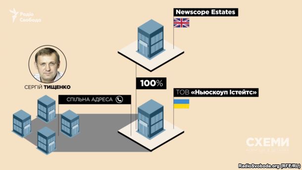 Кому же физически принадлежит фирма, которая получила такой выгодный для себя контракт? Британская компания владеет 100% акций украинской фирмы ООО «Ньюскоуп Истейтс», которая ранее называлась ООО «Подол-Сити». Реквизиты фирмы совпадают с реквизитами многих фирм бизнесмена Сергея Тищенко.