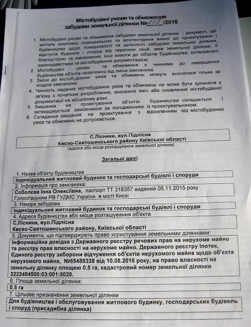 Приобретенный Вячеславом Соболевым участок был в числе тех, которые прокуратура пыталась вернуть в государственную собственность, но суд отказал в иске, и в сентябре Соболевы получили возможность развернуть стройку. Возводят «хатынку» площадью 860 кв. м. - исполняющий обязанности начальника градостроительства и архитектуры Киево-Святошинской райогосадминистрации Р.В. Мирчук согласовал этот проект, не дожидаясь судебной кассации.