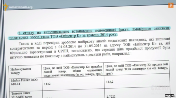 Журналисты также нашли документы, подтверждающие связь между «Эпицентром К» и «Новацентр К». Это акт проверки ООО «Алмера» Государственной налоговой инспекцией в Днепровском районе Киева. Эта фирма, как говорится в документе, покупала товары в «Эпицентр К», а продавала в «Новацентр К». Причем, «Эпицентр К» продавал многие товары, отмечают налоговики, по существенно заниженным ценам - по копейке. «Учитывая вышеизложенное установлены факты, вероятного заниженного налогового обязательства ООО «Эпицентр К »по май 2014», - говорится в акте.