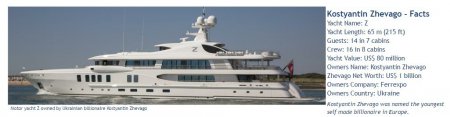 суперяхта Z (кто б мог подумать!) длиной 65 метров (215 футов) ценой около 80 млн долларов (эквивалент около 2,1 млрд грн). Числится она за Жеваго на всех профильных зарубежных «морских» сайтах.