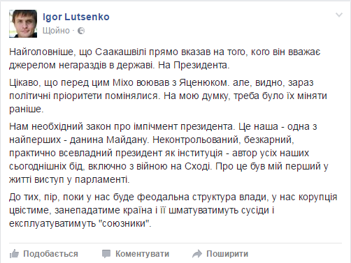 Нардеп Игорь Луценко: Нам необходим закон об импичменте президента