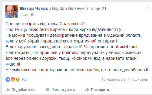 Причиной своего демарша экс-президент Грузии, не так давно получивший украинский паспорт, назвал невозможность воплощать реальные реформы и коррупцию. «Одесскую область сдают не просто коррупционерам, сдают врагам Украины. Мне надоело об этом молчать», – заявил Саакашвили. Политик также заявил, что для граждан ничего не поменялось. «Какая разница украинцам, кто будет к ним наплевательски относиться – Порошенко или Янукович?» – подчеркнул экс-президент.