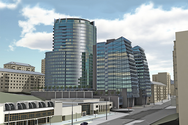 "Проектными предложениями предусматривается строительство современного офисно-гостиничного комплекса с широким спектром услуг, в состав которого входят два офисных 16-этажных блока с отдельными входными группами, расположенные вдоль Мечникова, и центральный 22-этажный объем отеля, расположенный в глубине участка" — указано на сайте Архитектурной мастерской А. Пашенько.