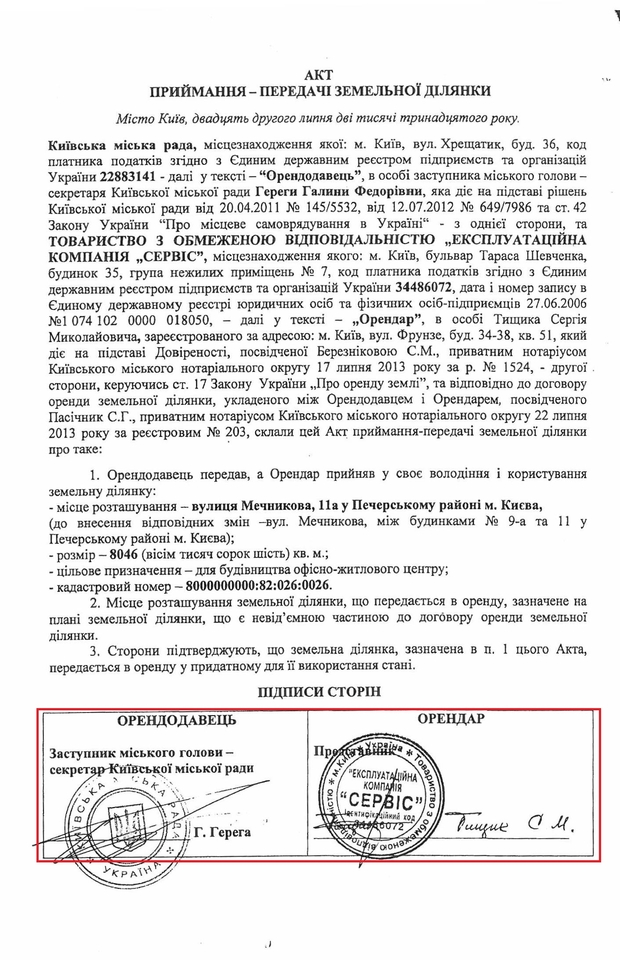 Как видно из документа, 22 июля 2013 года секретарь Киевсовета Галина Герега собственноручно подписала договор аренды с ООО "ЭК "Сервис", а также акт приема-передачи земельного участка.