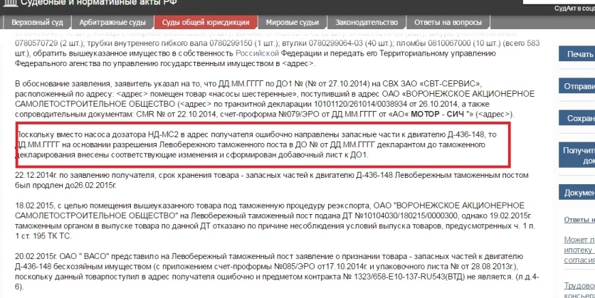 Так, наприкінці 2014 року на російській митниці затримали вантаж з України – відповідно до документів, насос дозатора для турбовального двигуна «Мотор Січі» АІ-450М (призначений для цивільних вертольотів). Але насправді, замість насосу прибули комплектуючі до двигуна Д-436-148, що використовується на літаках Ан-148. Суд визнав це відправлення «помилковим».