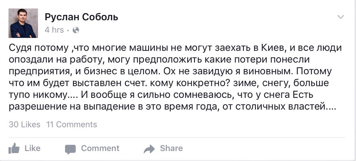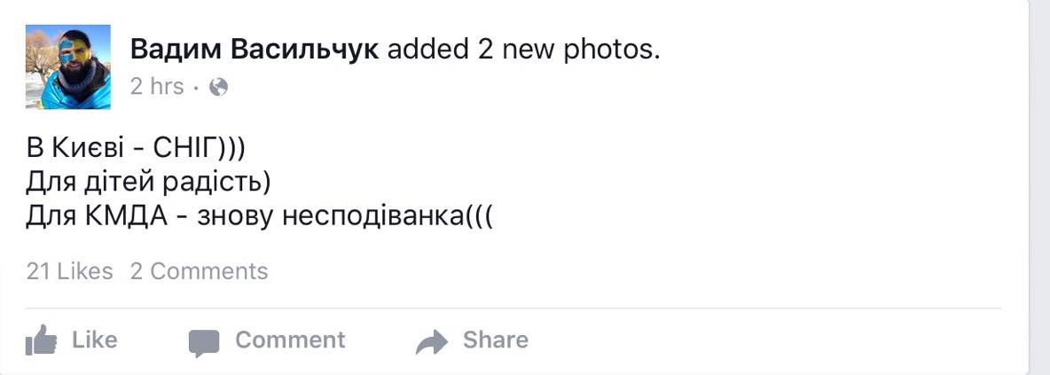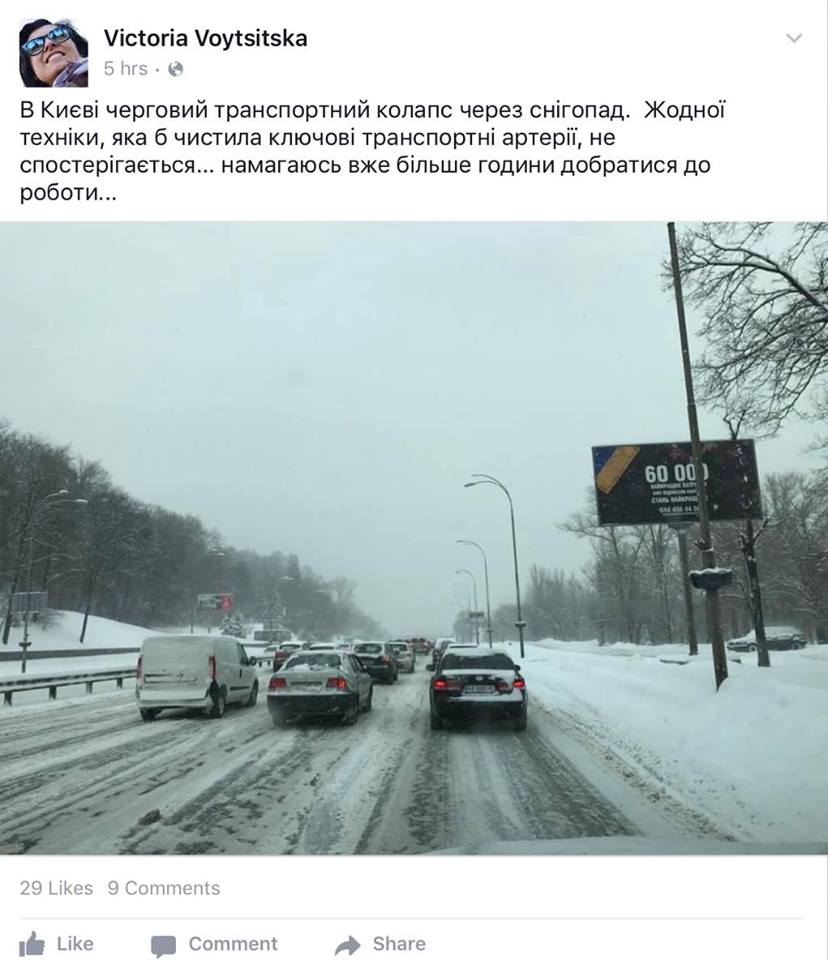 Мэр Киева Виталий Кличко во время координационного совещания признал, что утром ситуация с пробками была сложной и подчеркнул, что, согласно прогнозам синоптиков, снегопады продляться до среды. Параллельно в коммунальном предприятии «Киевавтодор» отмечают, что со вчерашнего вечера «непрерывно проводят работы по обработке и очистке улично-дорожного покрытия от снега».